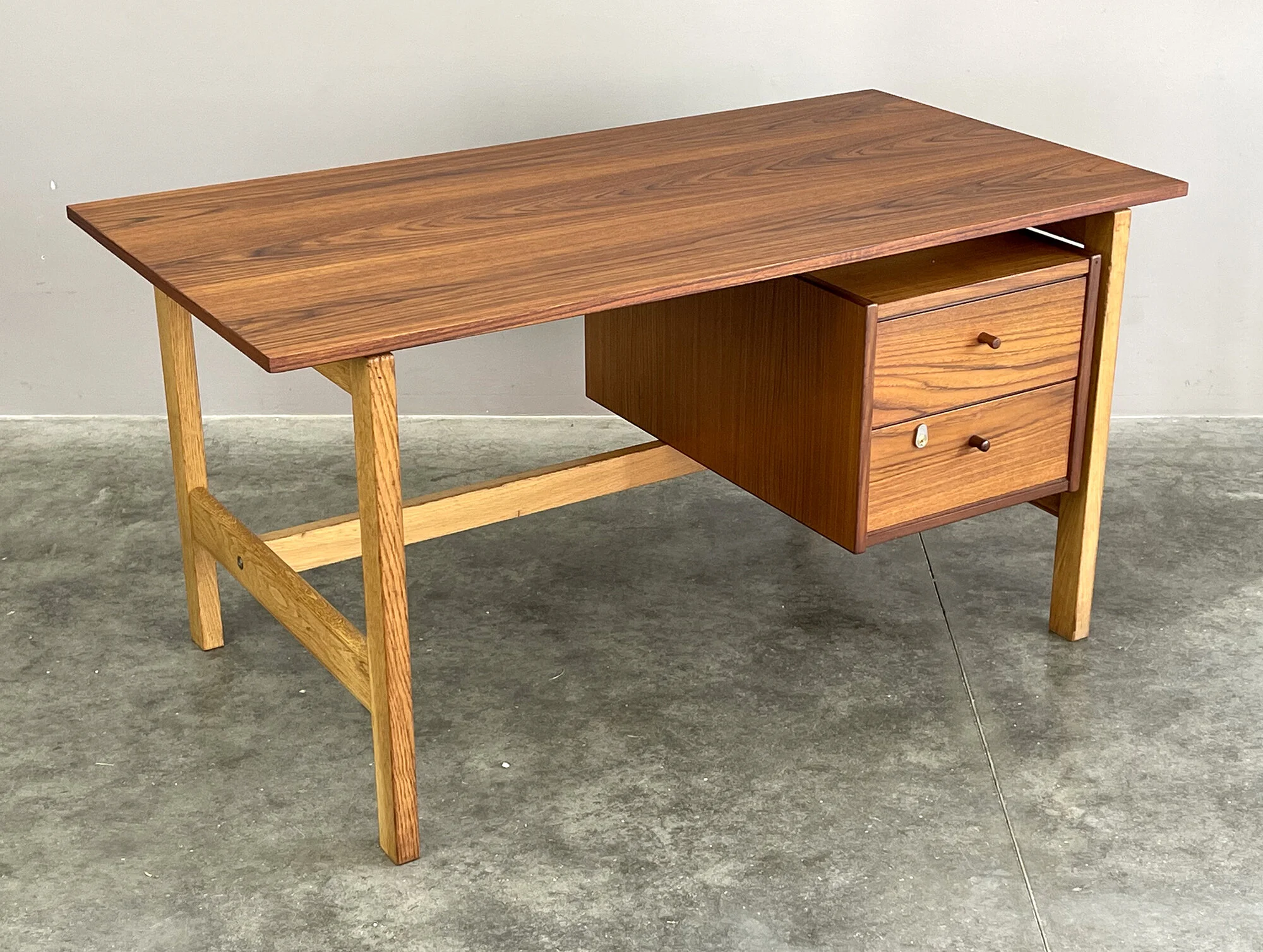 Such a handsome piece! This nicely-sized desk is perfect for a small home office: the bank of drawers even shifts to either side to best fit your space! By one of the most acclaimed of all Danish designers, Hans J. Wegner, for Getama, Denmark. Model 125. This desk was most often produced in all oak, but this particular piece features a spectacularly grained teak top and teak drawers to compliment the European white oak frame. We love the finely crafted drawer pulls and “floating” drawers. This desk is finished on the back for placement anywhere in a room, and the original keys are included!