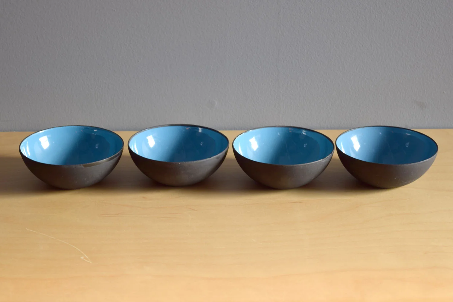 A set of four small iconic enameled steel bowls designed by Herbert Krenchel for Torben Örskov & Co in the 1950s. These are originals, not the recent re-issues. The interiors are a beautiful pale blue/green. A couple of the bowls have scratches to the interiors and small rim chips. Exteriors show wear as shown.