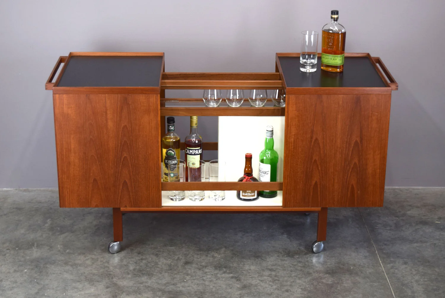 Such a cool piece! This is the teak version of Torbjørn Afdal’s highly sought after ‘Times’ bar cart, produced by Mellemstrands Møbelfabrik / Bruksbo in Norway, 1960s. It can be a rolling bar cart, or cabinet without the wheels. We just love the ingenious system of sliding and latching that expands the top for mixing and serving, and the fine brass details throughout.