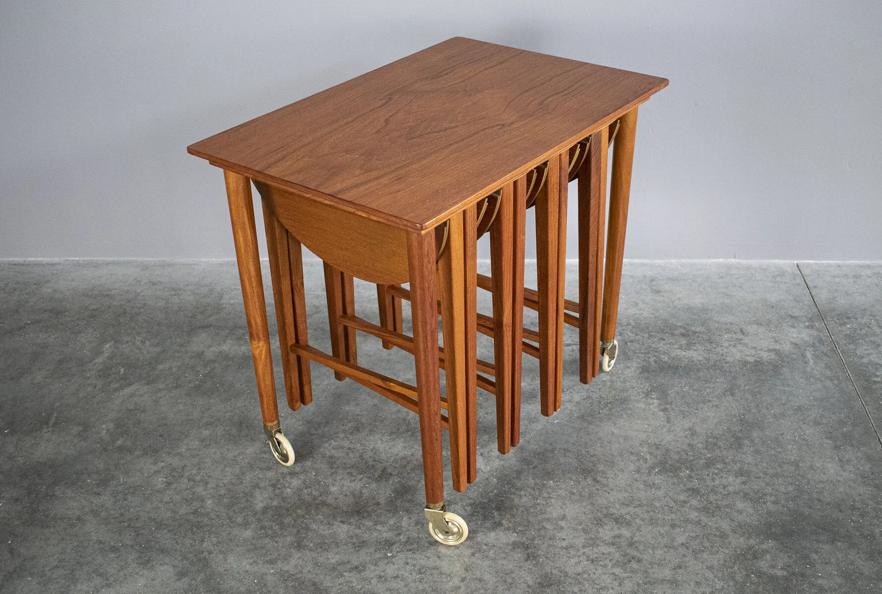 This is such a cool piece of furniture! Designed by Carlo Jensen. A sweet teak side table (on removable wheels) holds four individual folding tables. An ingenious solution for sensible storage and elegant entertaining! This set came from the collection of a family who purchased them in Denmark in the 1950s and had them shipped over to the US, where they remained in storage for many years. They were extraordinarily well-cared for, along with the rest of the Arne Vodder, Møller and Finn Juhl furniture we obtained from the same collection.