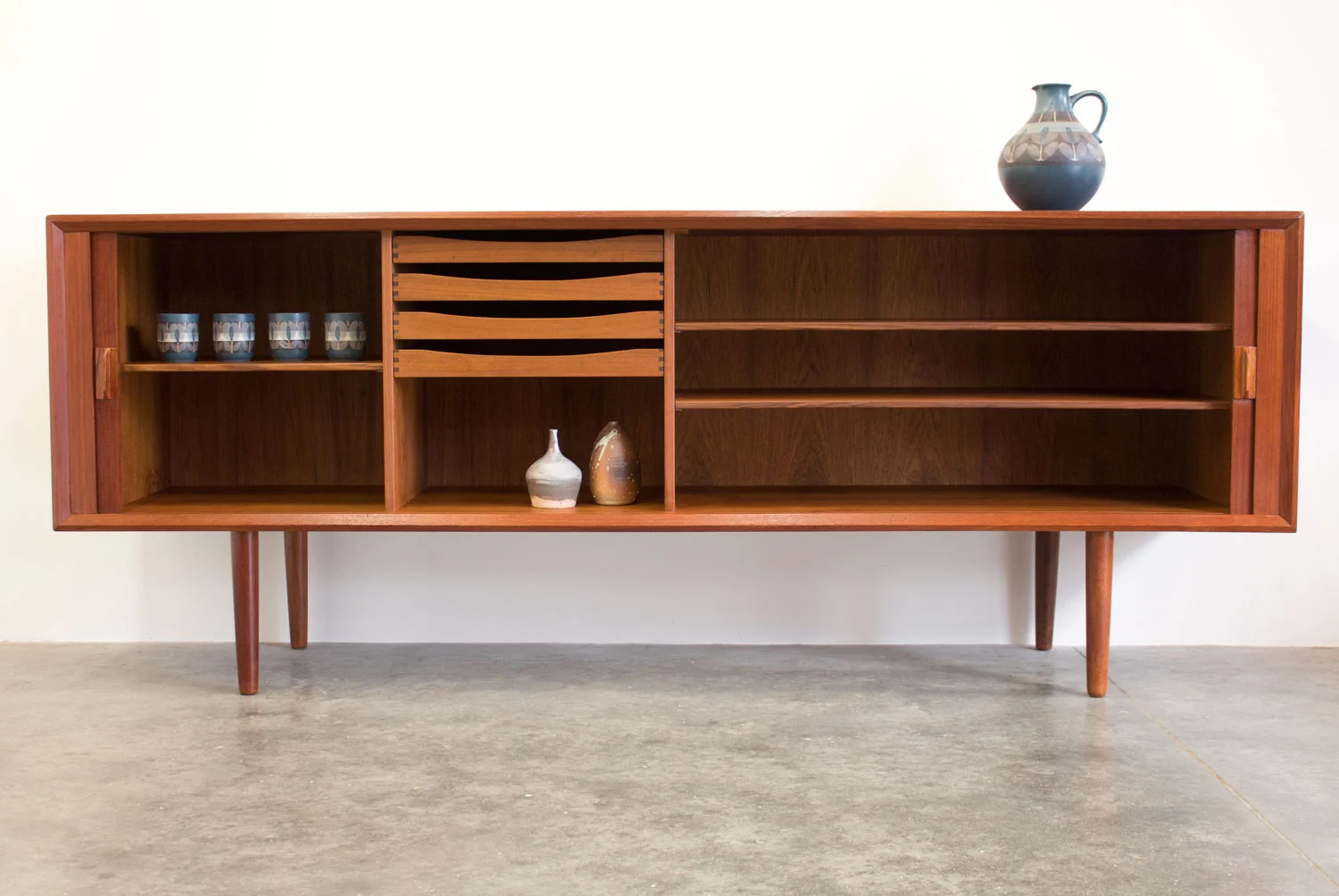A stunning example of this iconic Danish design by Svend Aage Larsen for Faarup Møbelfabrik 1960s. Long and lean in glowing teak with elegantly tapered legs and lots of shelf and drawer space for storage. The wonderful tambour doors roll away out of sight when opened. Inside are adjustable shelves and four felt-lined fingerjointed drawers. This piece is a real beauty!