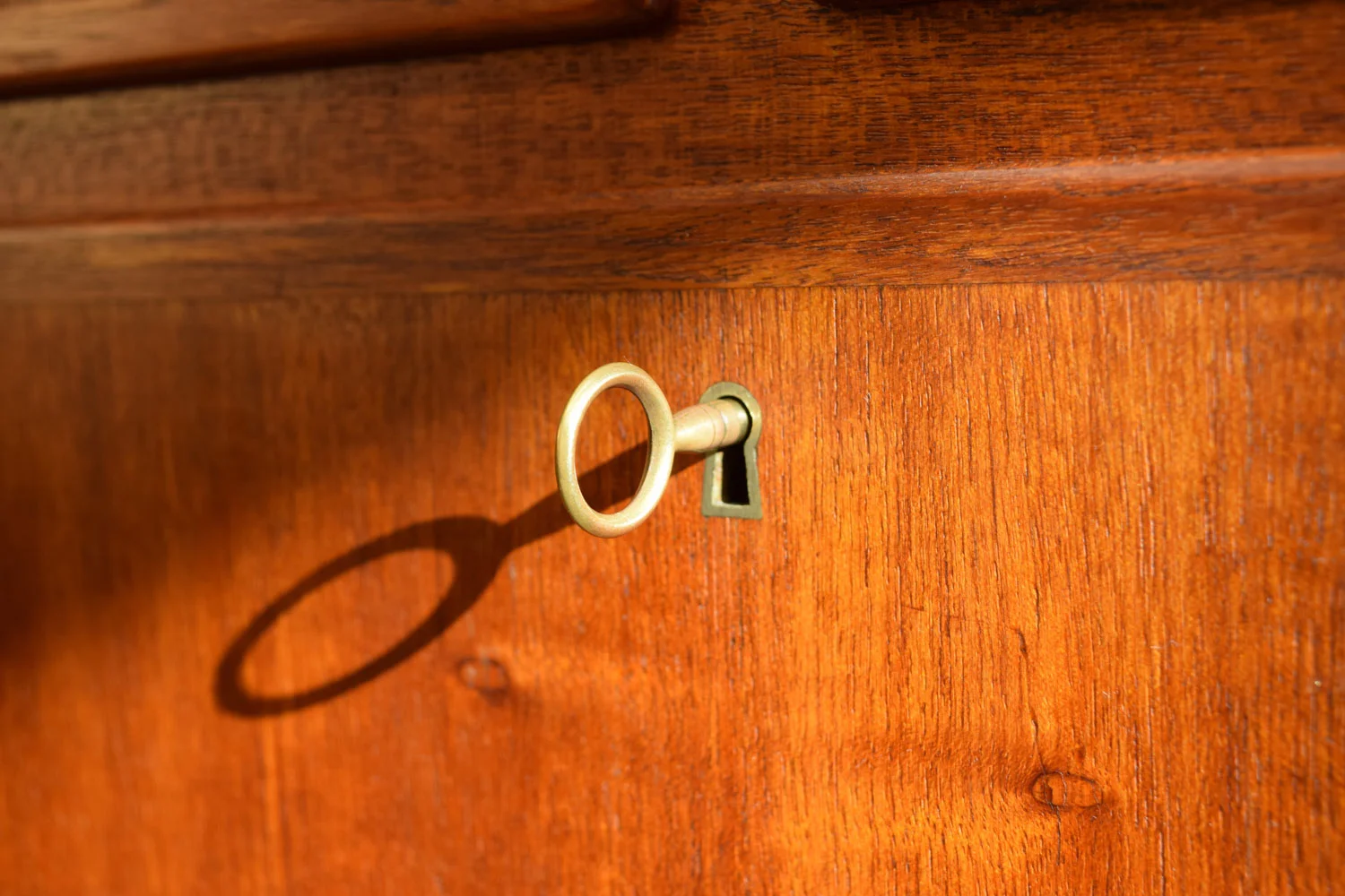 This desk is in very good vintage condition. The top has some very light scratches, a darker area where a blotter blocked the sun (will even out over time) and a couple of spots where the lacquer finish is slightly duller. The left side has four small filled holes, barely noticeable. The top left drawer has a chip, top right has a tiny corner chip, and the knee space has a couple of small chips. All drawers slide smoothly.
