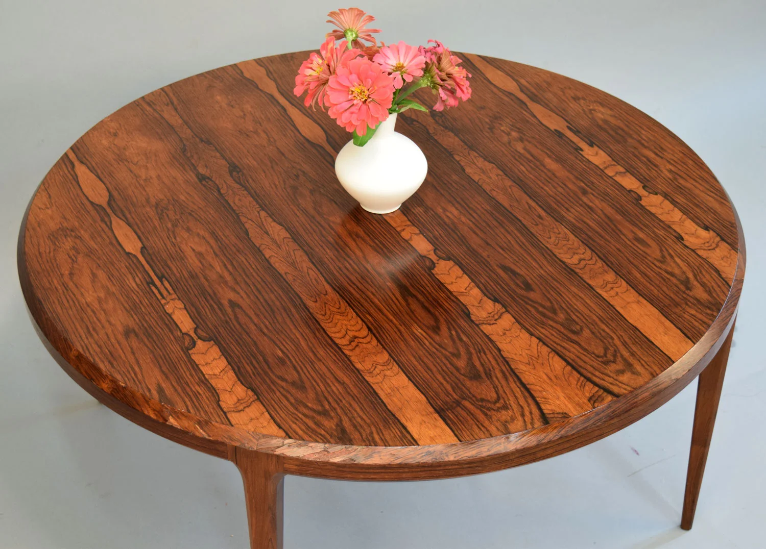 This table was professionally refinished with polyurethane at Teak Imports in Massachusetts by the original owner. The tabletop is now suitable for heavy family use. The leaves were not refinished and have their original patina and oiled finish.