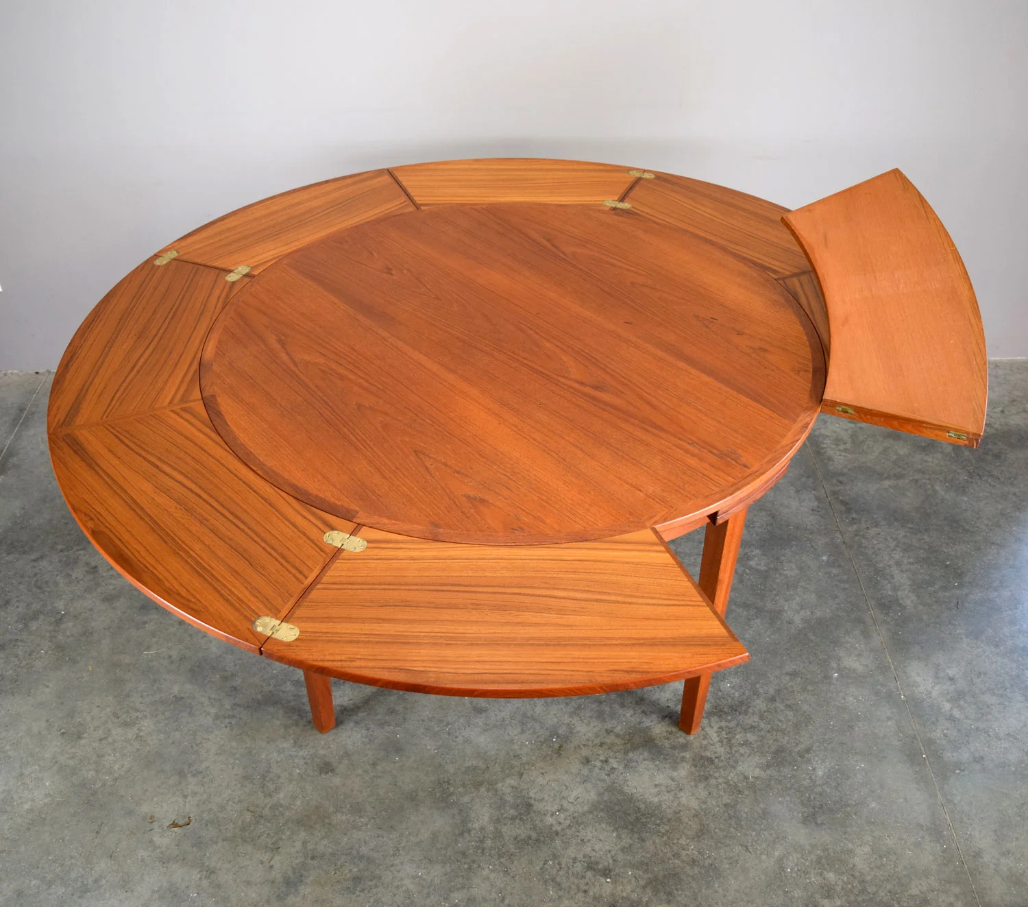 Oh those clever Danes! This beautiful teak dining table expands in a most unusual manner: four leaves slide out and then - flip flap - unfold to increase the diameter of the table significantly. When not in use, the folded leaves slide neatly back under the tabletop. Made in Denmark in the 1960s by Dyrlund Smith. So beautiful and cool!