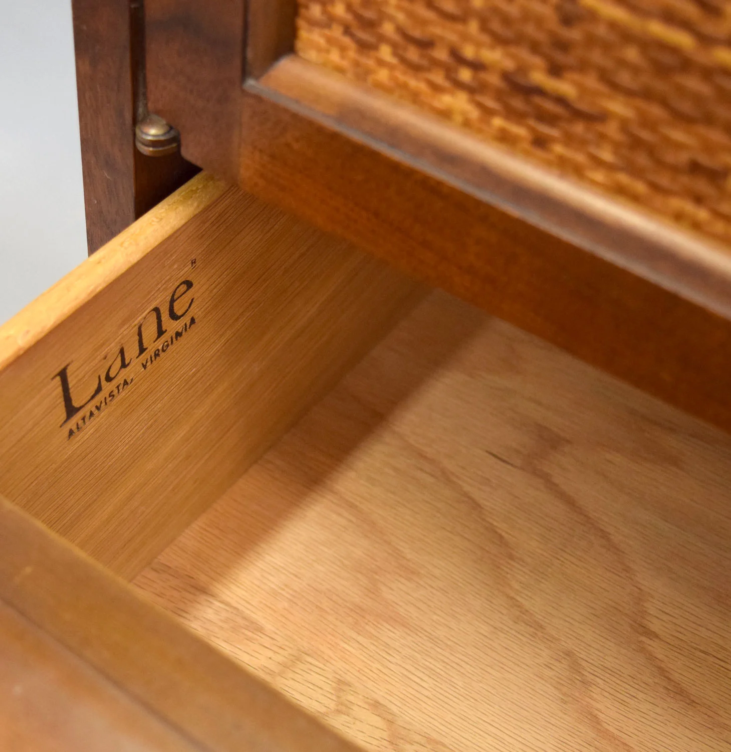 A gorgeous American walnut gentleman's chest or highboy dresser from Lane's "Rhythm" Collection. This is a heavy, substantial piece with tons of storage in the dove-tailed drawers and a beautiful Danish Modern style. The two top doors conceal three pull-out drawers, the door panels are reversible from cane to walnut. New solid brass door pulls.