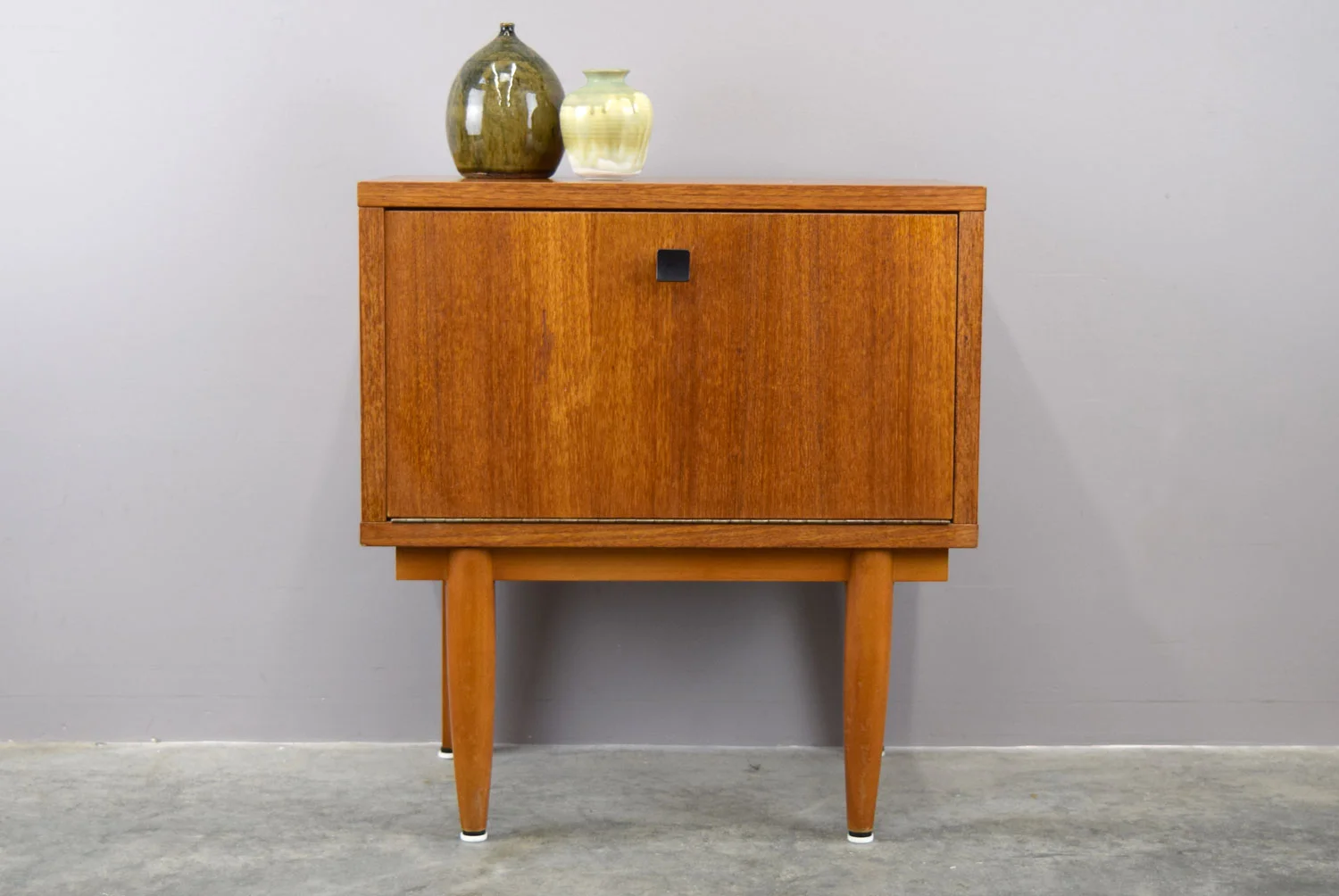The other has one drawer and a drop-down cabinet. There is a light circular mark on the top, most likely from something placed there blocking sun exposure, which should even out over time. Some veneer chips as shown. 18.75" wide x 11.375" deep x 20.375" high