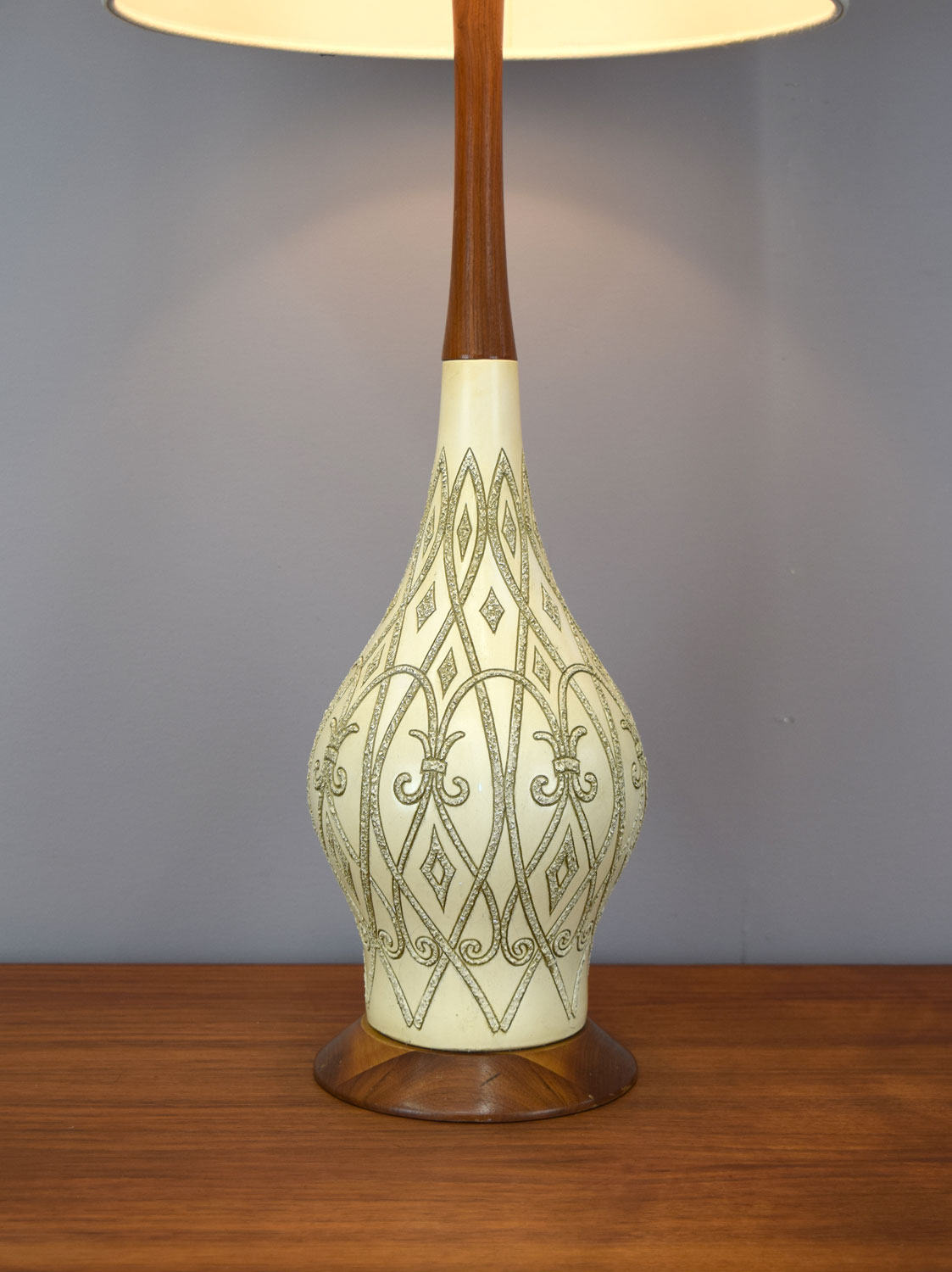 Wonderfully shaped tall table lamp from the 1950s. In very good condition with light wear.